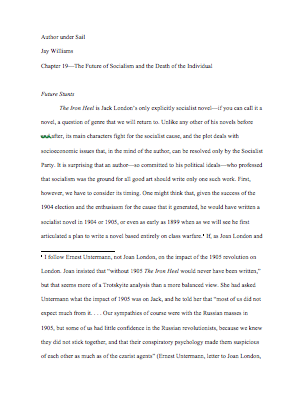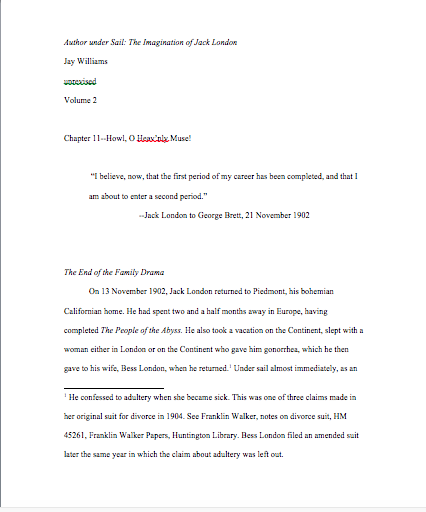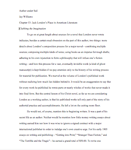 My most recent completed work is the second volume of my biography of Jack London: Author Under Sail: The Imagination of Jack London, 1902-1907; the first volume ranges from 1893 to 1902. This excerpt is from the introduction. Below the excerpt are links to the unrevised chapters of this volume. I was asked to cut a considerable amount from this manuscript; I believe the final version is four hundred or so pages shorter. For example, I cut four pages in the first chapter that discussed George Brett’s working relationship with Upton Sinclair; it contrasts nicely with Brett and London’s relationship, showing in a new way how special it was. I cut nearly every citation to and arguments with other peoples’ work. I cut a long footnote that included London’s stage directions for the theatrical version of Scorn of Women, which have never been published. And so on. I believe the final version is much better for the cuts, and I thank UNP for pressing me to do so. This version has not been copyedited, so please be kind, though let me know of errors. They are entirely my own.